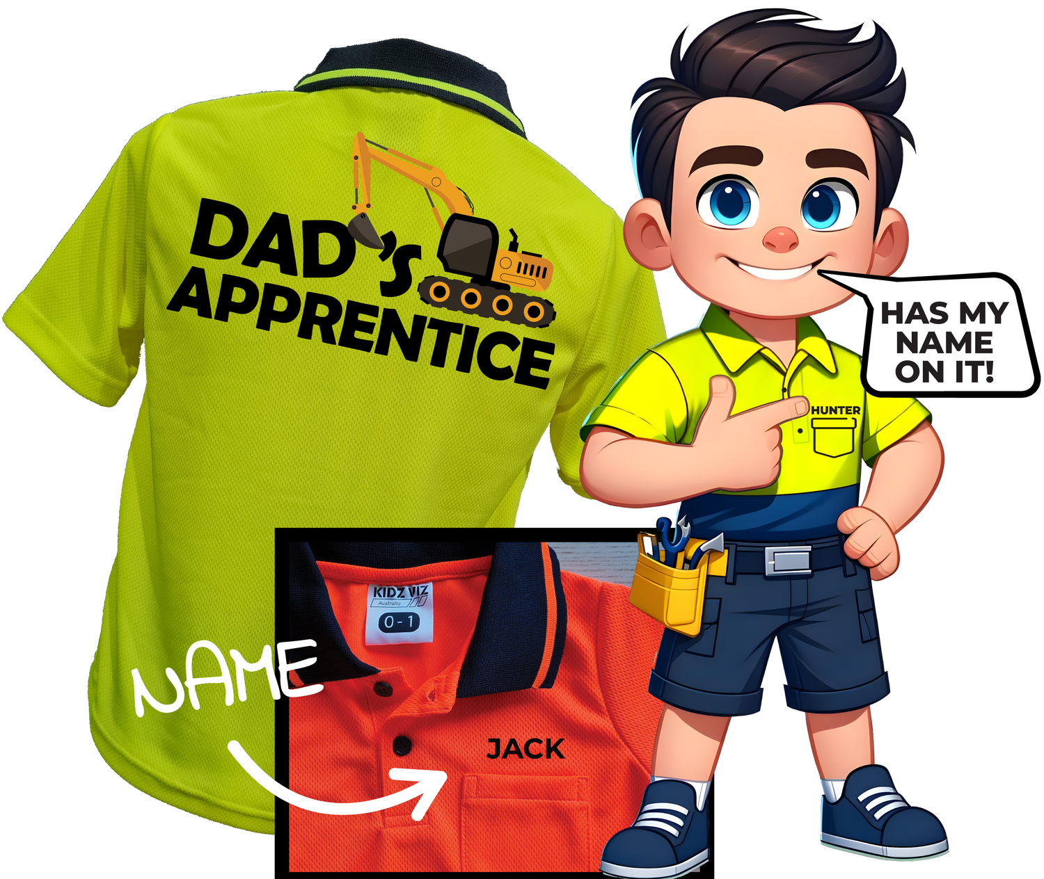 Kidz Viz is Australia’s leading brand of kids hi-vis tradie polo shirts for ‘Dad’s Boss’, ‘Pop’s Helper’ or the ‘1st Year Apprentice’. With over 80+ designs to choose from (and custom designs available) you’re sure to find the perfect shirt for the ‘Little Sparky’ or ‘Farm Hand’ in your family. These professionally screen printed designs were created right here in Australia.